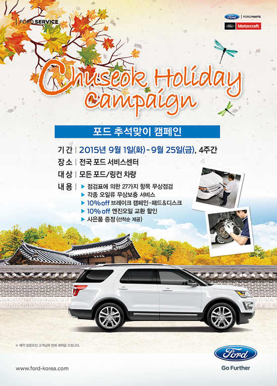 9월 1일부터 25일까지 4주간 진행되는 이번 캠페인은 포드·링컨 모든 차종을 대상으로 한다. 캠페인 기간 동안 방문 모든 예약 고객을 대상으로 무상점검 및 각종 오일류 무료 보충, 엔진오일 및 브레이크 패드·디스크 교환 시 10% 할인 등 장거리 주행에 꼭 필요한 서비스들이 대폭 할인된 가격에 제공된다. 또한, 방문 고객에게는 한가위 명절 맞이 소정의 사은품도 선착순 증정된다.